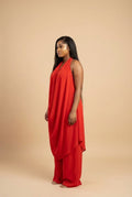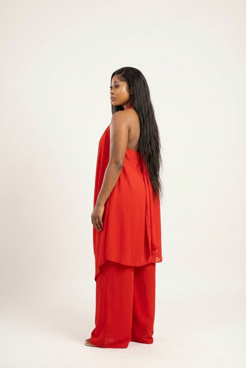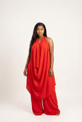 Elegant Red Draped Halter Tunic and Wide Leg Pant Set