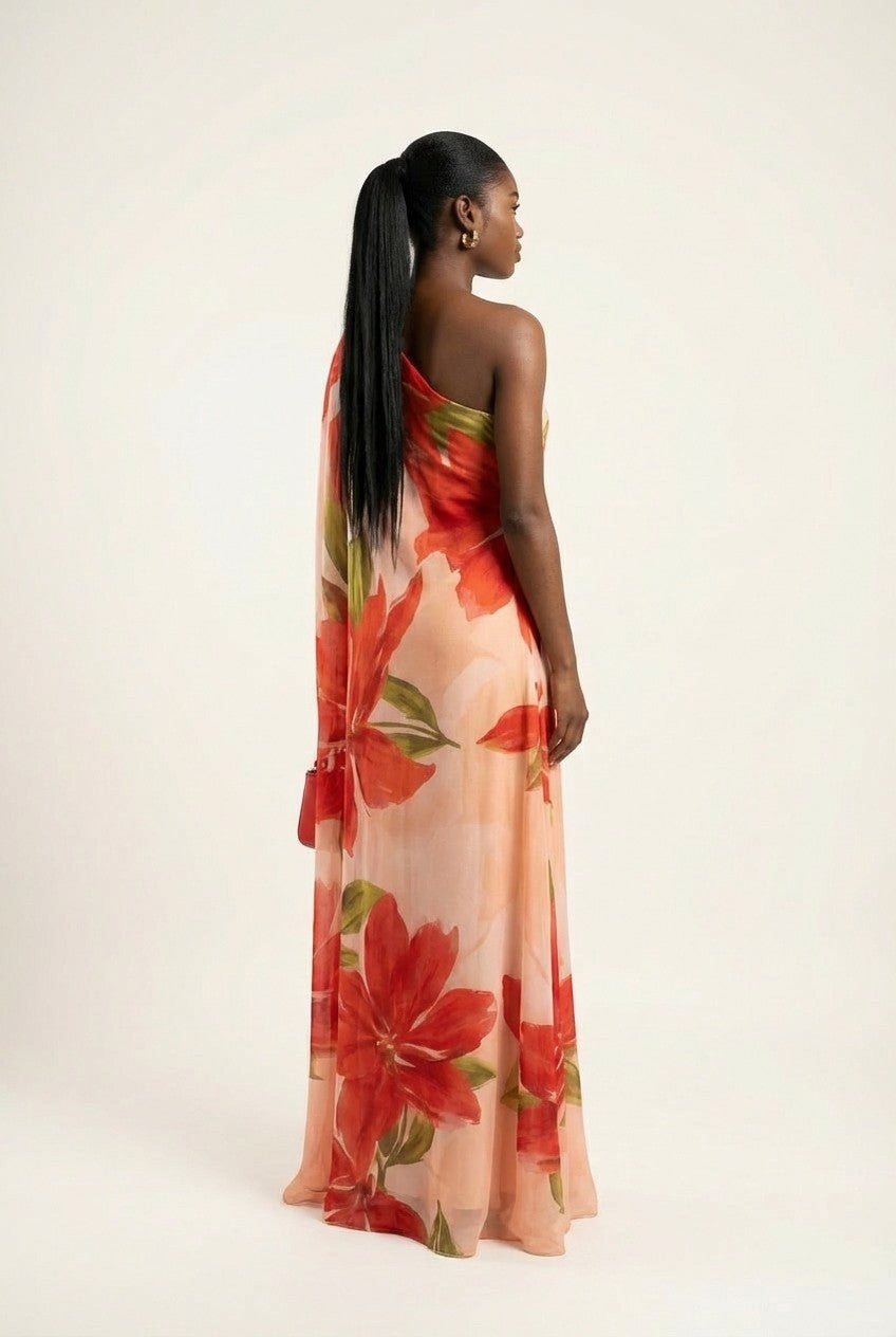 Captivate every room with botanical grace. This stunning one-shoulder maxi dress blends effortless movement with a bold floral print, making it the perfect choice for high-end events and summer soirées.