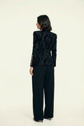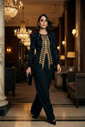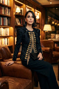 Women's Structured Black Jacquard Military Jacket with Gold Chains
